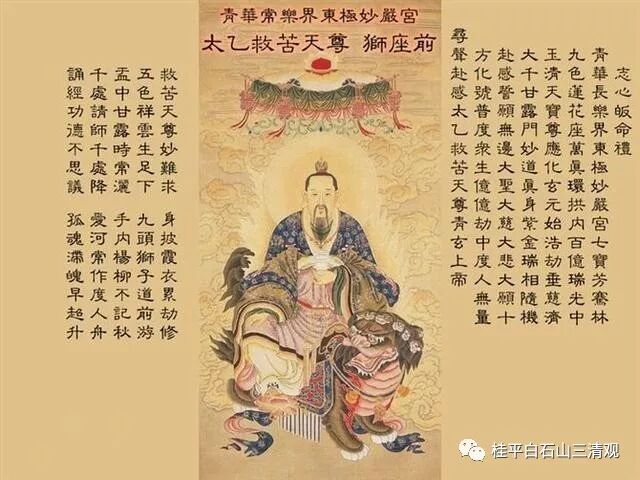 尔时元始天尊。在玄景之上。清微天中。九色玉堂。升七宝座。放大光明。普集万灵。与天教化。十方天尊。道君老君。帝君元君。丈人圣人。万万仙众。俱来诣座。听宣妙法。於是梵王称善。帝释欣歌。仙乐自响。随光而至。是时太上老君。身离玉座。步蹑莲花。真人侍於左右。玉女扶於曳裾。至天尊前。奏曰。臣等蒙师开化。受福天堂。施功无极。恩不可量。臣观三界之中。苦海之内。无量众生。横遭厄难。罪网牵缠。异类寻情。难逃生化。臣不可住於太清。欲仗威光。分身三界。救度寻情。唯望至尊。观心慈愍。 於是元始天尊。微起法身。告老君曰。善哉。汝离玉座。惊怖万天。救苦救生。不须汝言。可还座中。吾为宣说。 天尊曰。万物吾生。万灵吾化。遭苦遭厄。当须救之。不须汝威力。化身救度。此东方长乐世界。有大慈仁者。太乙救苦天尊。化身如恒沙数。物随声应。或住天宫。或降人间。或居地狱。或摄群邪。或为仙童玉女。或为帝君圣人。或为天尊真人。或为金刚神王。或为魔王力士。或为天师道士。或为皇人老君。或为天医功曹。或为男子女子。或为文武官宰。或为都大元帅。或为教师禅师。或为风师雨师。神通无量。功行无穷。寻声救苦。应物随机。今告汝知。老君重奏曰。此之威神。有无量变化。如何得至我师御前。天尊告老君曰。汝可举声。唱太乙之名。使仙官齐咏。自然应化现身。於是老君众仙等。尊其教旨。齐声称咏太乙救苦天尊之名。 忽见。帝君班中。有童子一人。步步蹑於莲花。稽首至天尊前。奏曰。臣乃太乙。为我师开化说法。臣集相聚形。听宣妙音。天中快乐一时。地下动经万劫。三界之中。群生受苦。高声呼唤。苦哉苦哉。旋绕天尊礼拜。俯伏乞下天关。