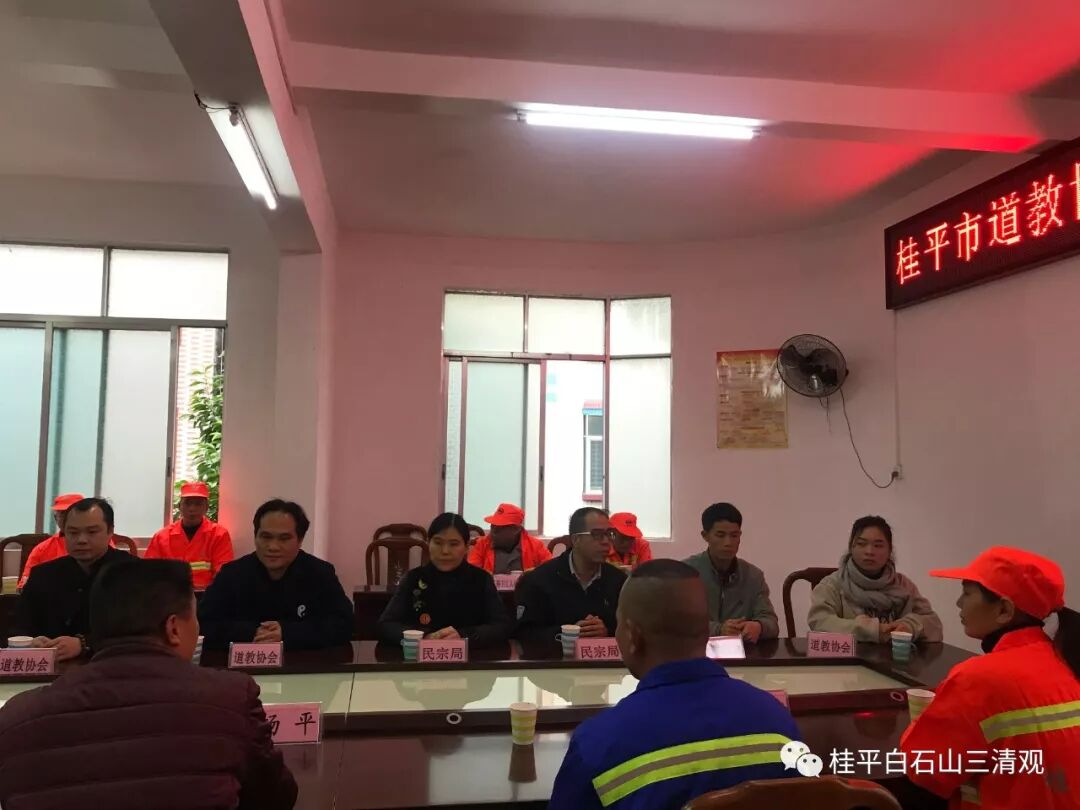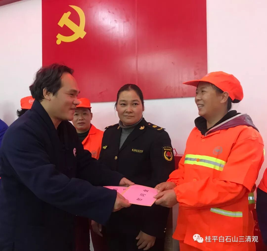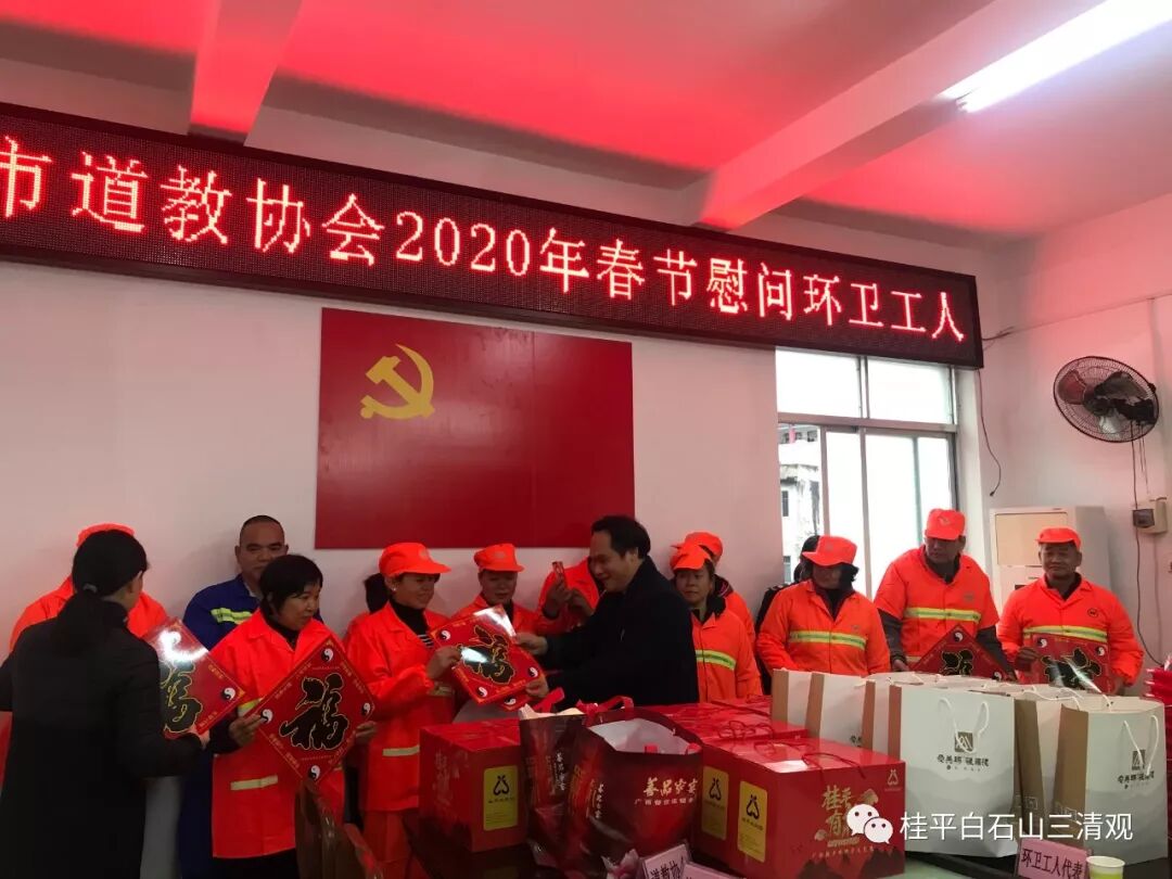 2020年1月16日,新春佳节将至,为感谢城区清洁工人长期以来的辛苦付出,确保他(她)们欢乐祥和过春节,1月16日下午,由桂平市道教协会组织对城区环卫处贫困清洁工人代表进行集中走访慰问,送上春节的关怀和祝福。参加本次活动的有桂平市民宗教事务局副局长伍燕燕,广西道教协会副会长、贵港市道教协会会长、桂平市道教协会会长、白石山三清观住持陈应伟道长以及白石山三清观弟子代表等。