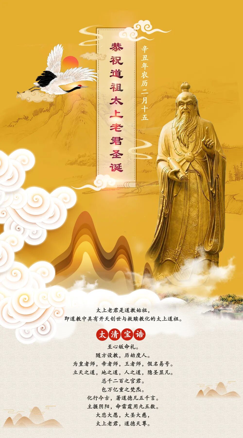 太上老君是三清尊神中受到最多香火奉祀的神明,度人无数,为三教之师;老子就是太上道祖的第十八世化身,因其传下道家经典《道德经》,故称老君为道德天尊,也被道教奉为开山祖师。 太上老君是道教最高神明“三清”尊神之一,在东汉时期降临蜀地,传授祖天师张道陵《太平洞极经》、《正一盟威二十四品法箓》、三五都功玉印、雌雄斩邪剑等经书、法器,拜为天师,嘱咐天师广行“正一盟威之道”,扫除妖魔,救护生民。 纵观中国历史,最强盛莫过于汉、唐二朝。汉代,以道教“无为而治”的思想治国七十余年,开创“文景之治”;陇西李氏更是太上老君的后代子孙,唐高祖李渊为老君三十代圣孙,唐高宗尊太上老君为“玄元皇帝”,践行道教开明治国、亲民贵生的思想,赢得四方民心,致使八方来朝,万国衣冠拜冕旒的盛况。这两朝的兴盛都与太上老君有密切的关系。 唐开元年间,玄宗即下诏,规定二月十五道祖老君圣诞为法定节日,全国休假三日以襄庆祝,武宗时正式定名为降圣节。自古言必称汉唐,可以说老君圣诞是才是我们国人的“圣诞节”。 二月十五,不仅是老君降诞之日,更是大道显化,重启生机之时。因此,这这一天除了适宜祈福纳祥之外,更是学道之士返本还源、谢罪自新的良辰吉日。 每到二月十五,无论道俗,均隆重庆贺。