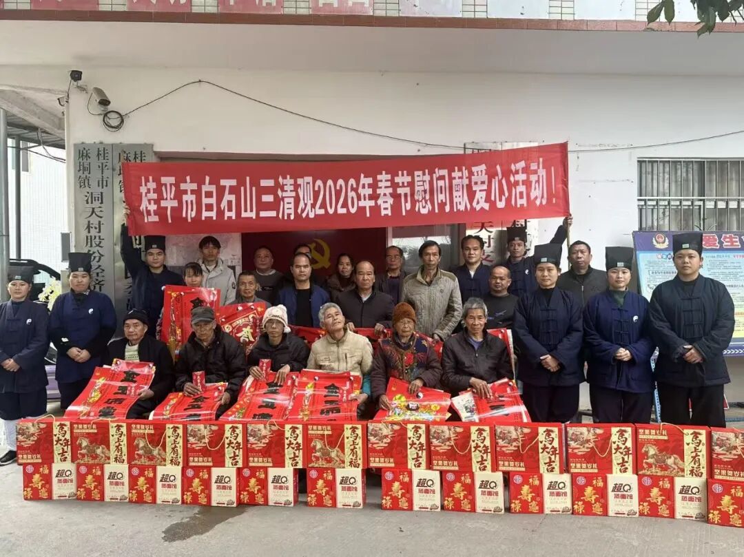 声声问候显真情,句句祝福暖人心,在本次慰问活动中,桂平市白石山会仙岩道众弟子一行,看望慰问了信众代表及困难群众约30人,为他们送上面条、牛奶、春节礼包、水果、福字等慰问品及慰问金。