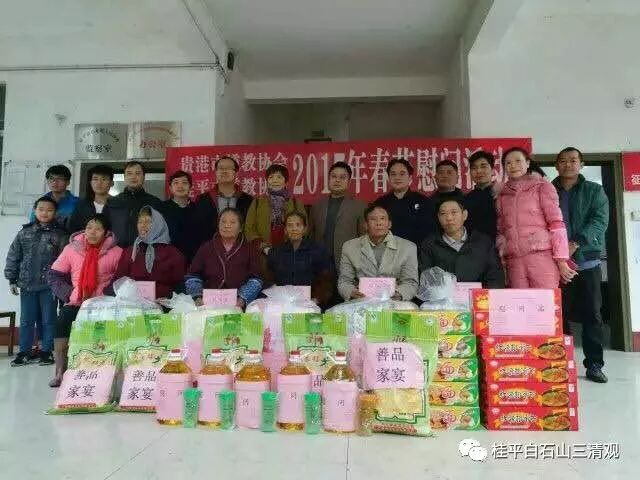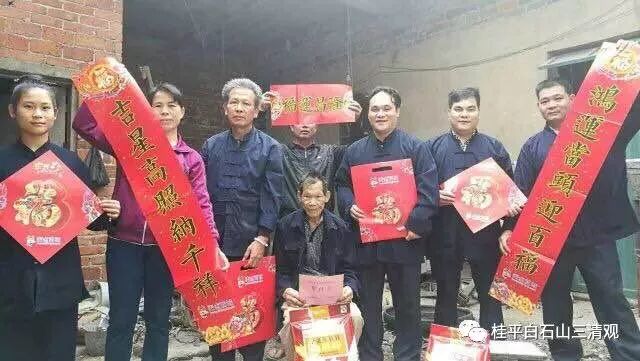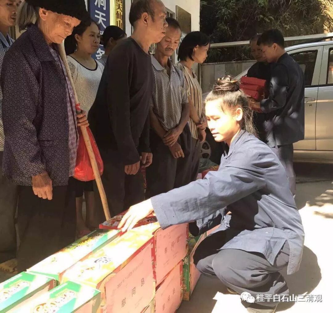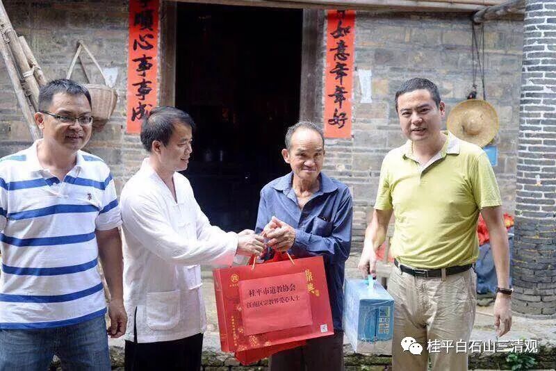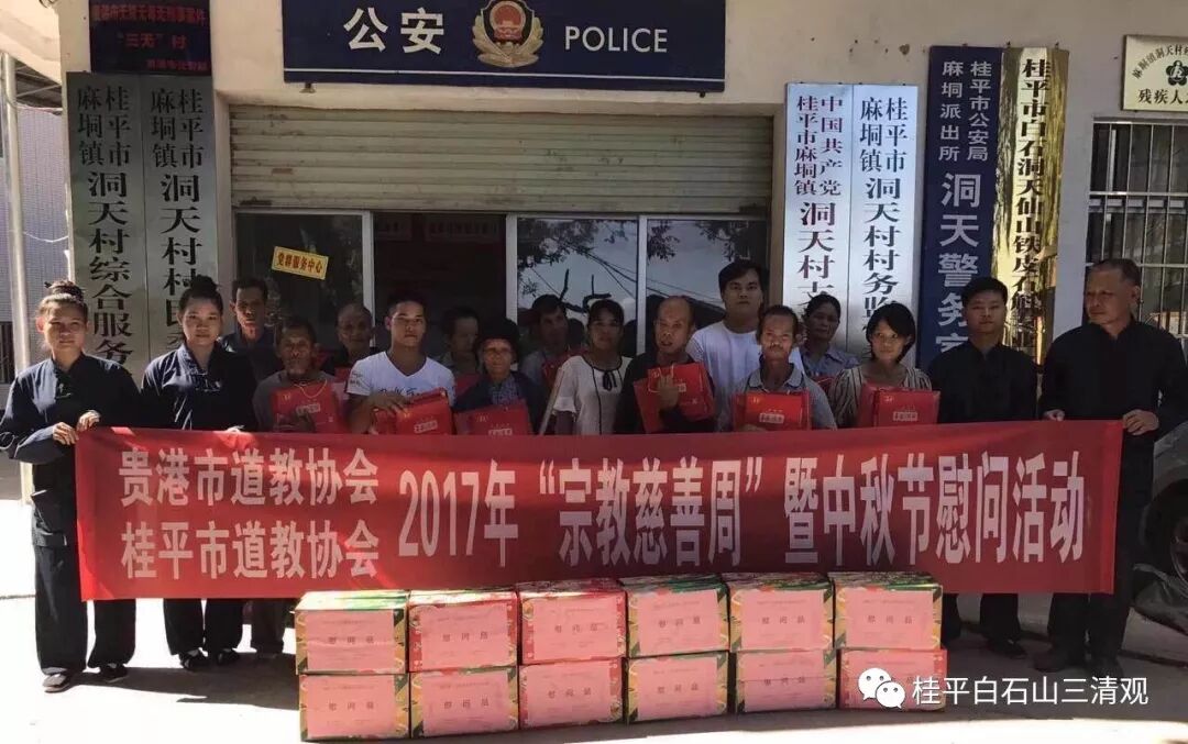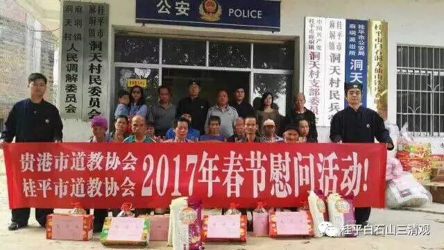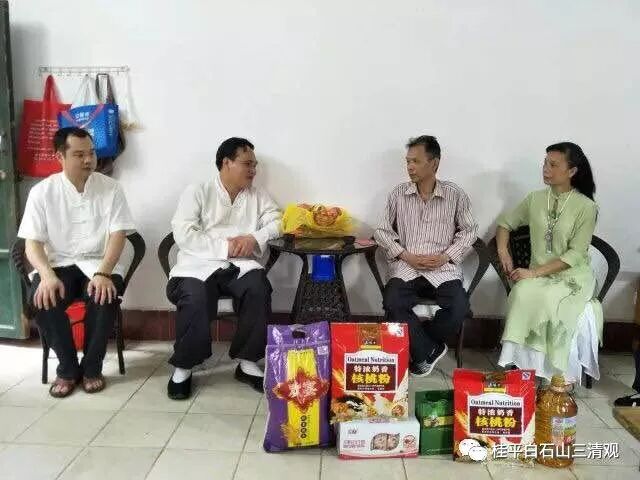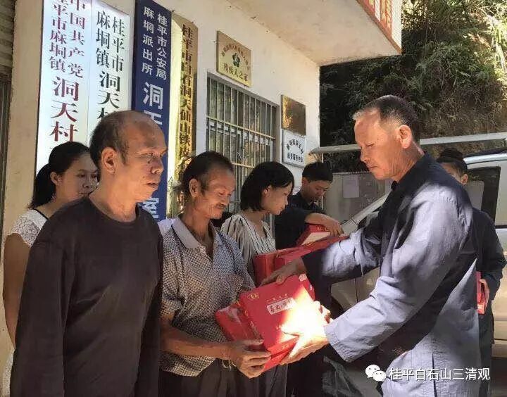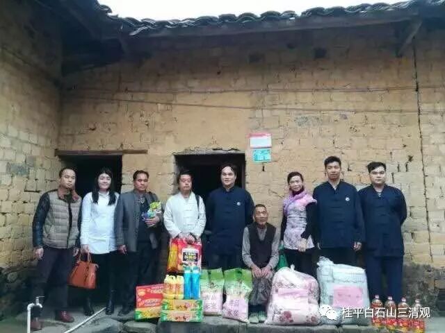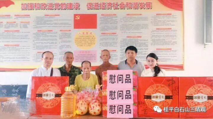 白石山三清观,位于广西桂平市麻垌镇侧,距市区40多公里。属全国道教名山圣地、全国道教三十六洞天之第二十一洞天---白石洞天! 2017年来,白石山三清观、会仙岩、白沙罗丛岩全体道众高举爱国爱教、遵纪守法的伟大旗帜!坚决支持拥护中国共产党的领导!在党和政府的领导下、在宗教部门的指导下、在广西道教协会副会长、贵港市(桂平市)道教协会会长、白石山三清观住持---陈应伟道长的带领下,全市道教界认真学习和贯彻党的十九大精神!坚持宗教中国化。积极引导广大信众走社会主义道路,按照新修订的《宗教事务条件》相关要求,依法加强道务工作管理,以及不断将道教文化和道教慈善慰问、助贫脱困献爱心活动推向文明化、健康化的方向发展!引导道众开展相关活动。秉承陈应伟道长的开示:“弘道修行,要:认认真真做事,老老实实做人”。以下图片是2017年,一年来的慈善慰问的活动回顾!