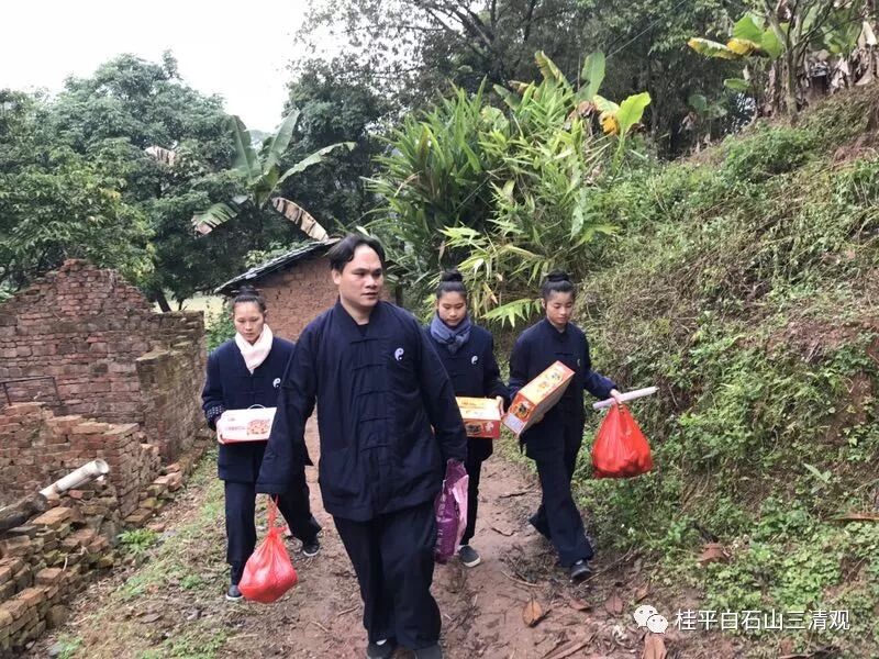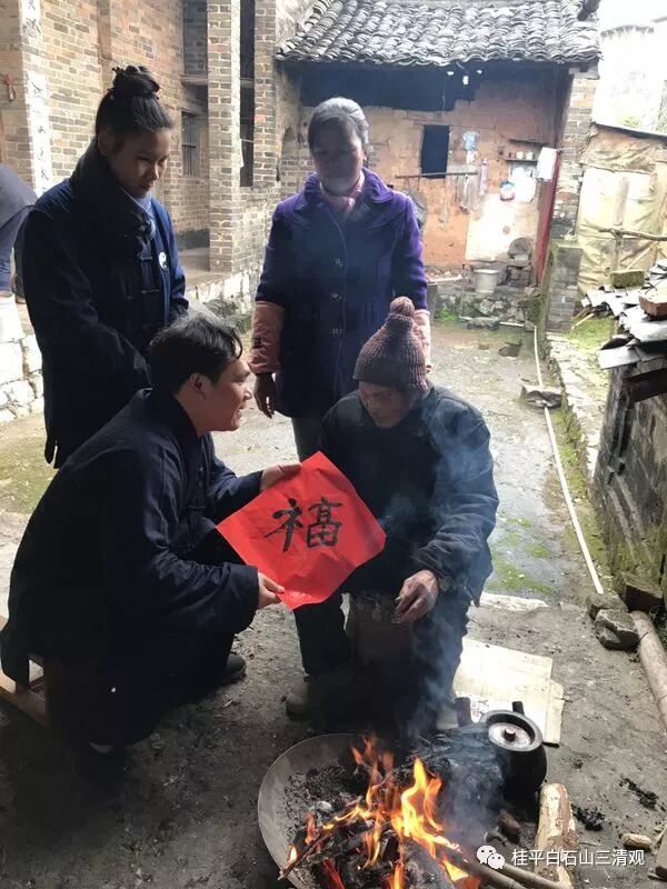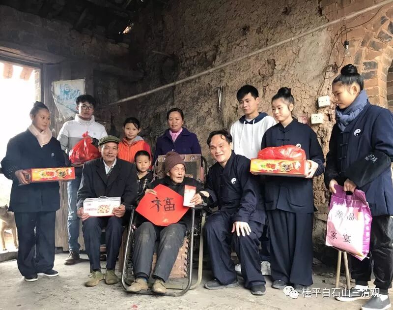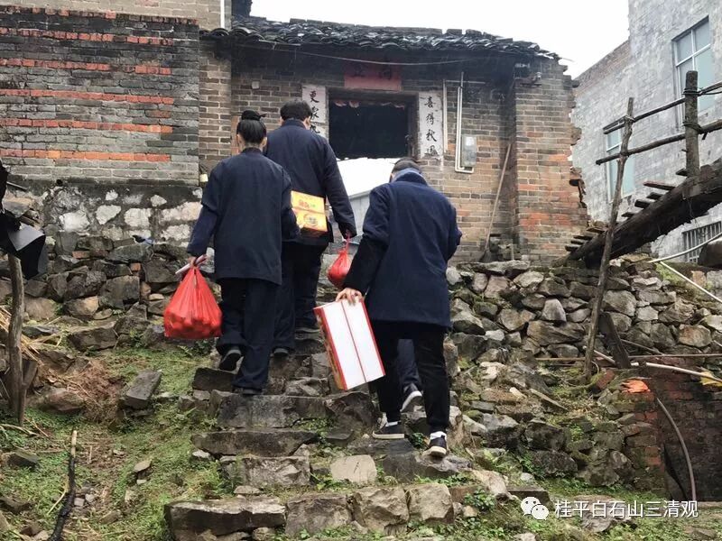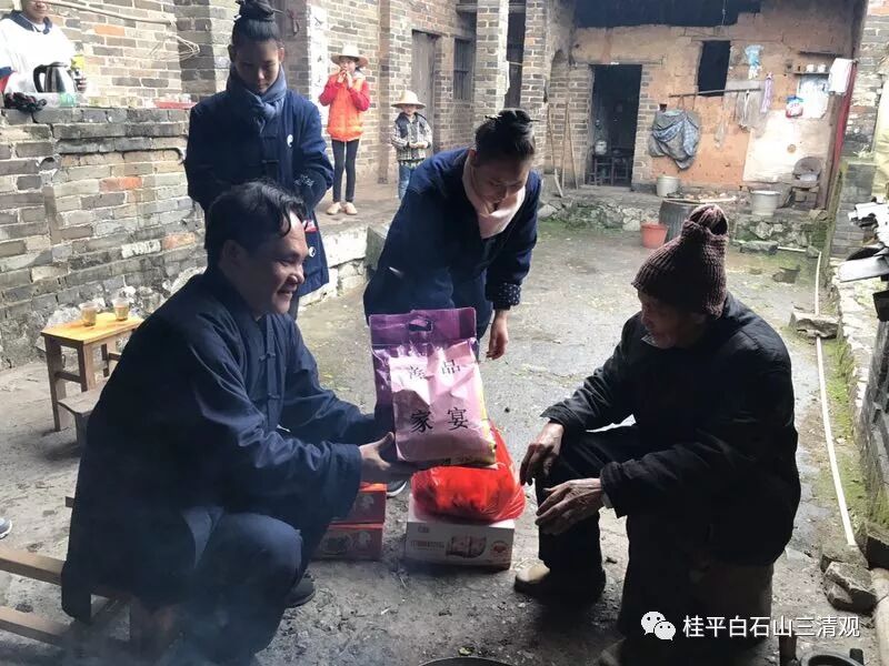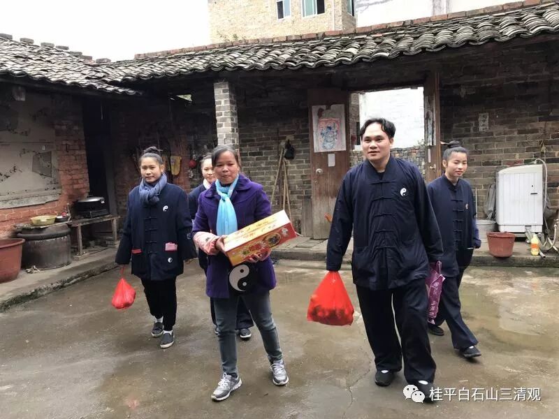 广西道教协会副会长、贵港市道教协会会长、桂平市道教协会会长、白石山三清观住持---陈应伟道长率领道众、弟子,在社会爱心人士的支持下,在桂平城区、西山镇长安村、福山村等地慰问。活动开展以来共为4户困难家庭送上了新春的慰问和祝福。为每户家庭发放了慰问金、大米、面、花生油、营养品、水果等各一份。其中,还送上白石山三清观2018年门神“门官”,以及白石山三清观道长手书的“福”字。此次活动得到了当地村民群众及当地方政府的高度赞同。更体现了践行道教济世利人、齐同慈爱的宗旨和文化、精神!