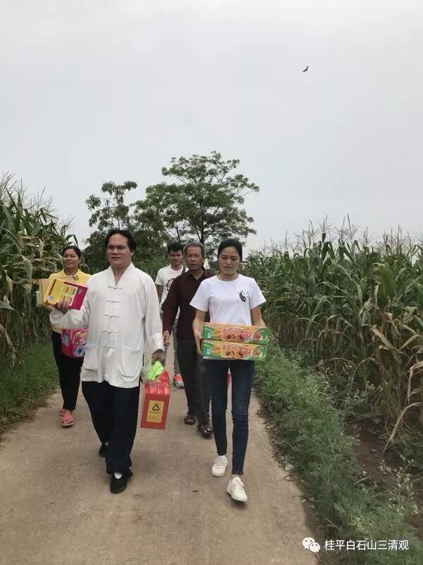 广西道教协会副会长、贵港市(桂平市)道教协会会长、白石山三清观住持---陈应伟道长率领白石山三清观弟子陈奕焕、柒春桂、李慧柱、柒文健等深入社步镇清石佛子冲村贫困户慰问孤寡户及贫困儿童。