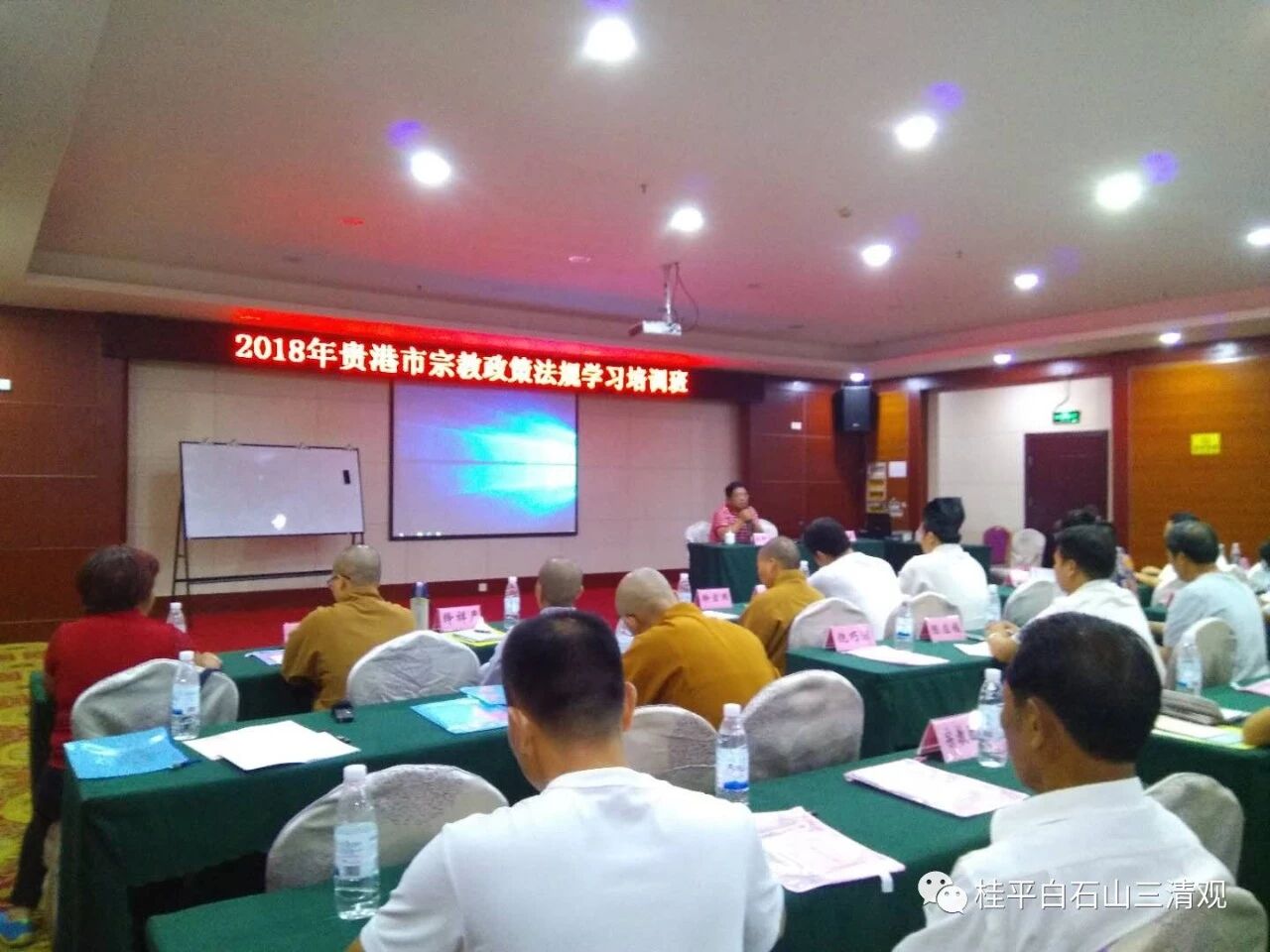 2018年7月5日,“贵港市宗教政策法规学习培训班”在贵港市区举行。市民宗委副主任莫松坚主持开班,广西区民宗委副主任梁柳宁讲课。来自“三区两县市”各统战部、民宗局以来各乡镇、各宗教代表人士约70多人参加学习培训。