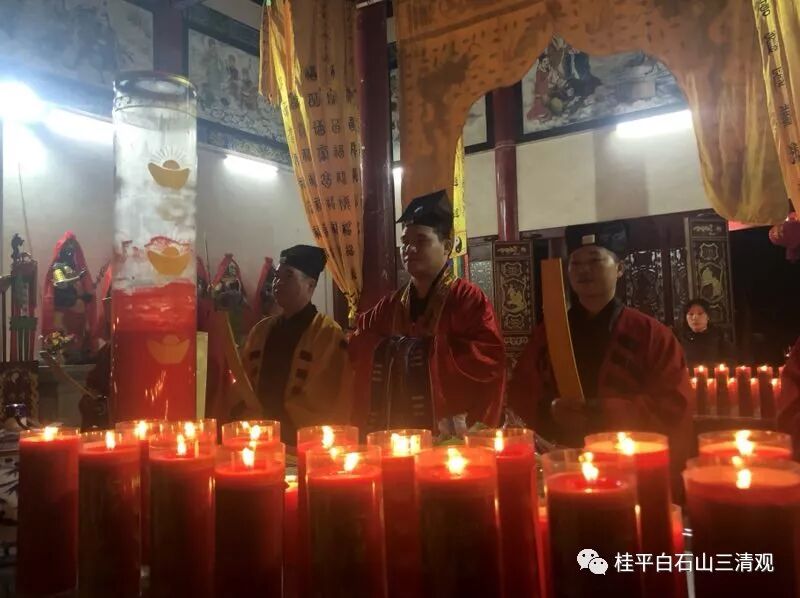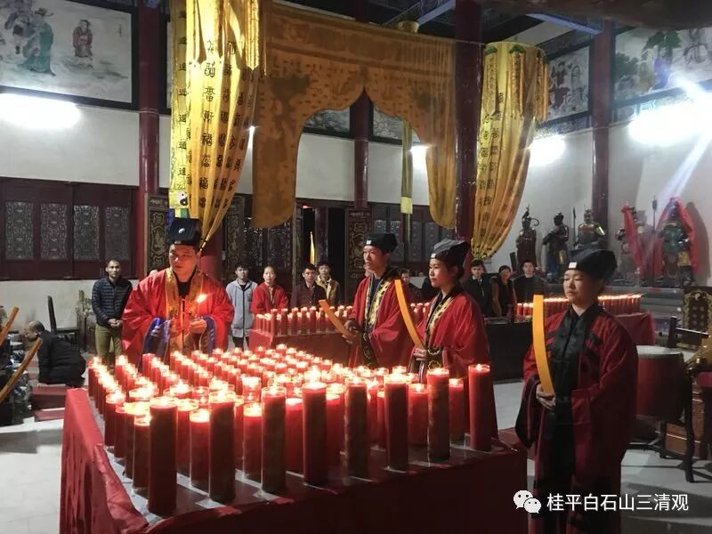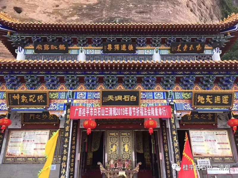 2019年(己亥)正月初一日春节,为弘扬传统道教文化,展示道文化的魅力,同时也满足广大信众的需求,正月初一日——十五日,在广西道教协会副会长、贵港市道教协会会长、桂平市道教协会会长、白石山三清观住持——陈应伟道长的带领下,全国道教名山圣地、全国道教三十六洞天之第二十一洞天——白石洞天!广西桂平市白石山三清观、会仙岩安排了春节纳福迎祥系列法会。除夕夜跨年祈福法会、初一日春节供灯祈福法会。并相继于初二日开年旺运法会、初三日文昌升学法会、初五日“接财神”、初九日玉皇祈福法会、十五日上元天官圣诞祝寿法会、化解太岁礼斗消灾祈福法会等。