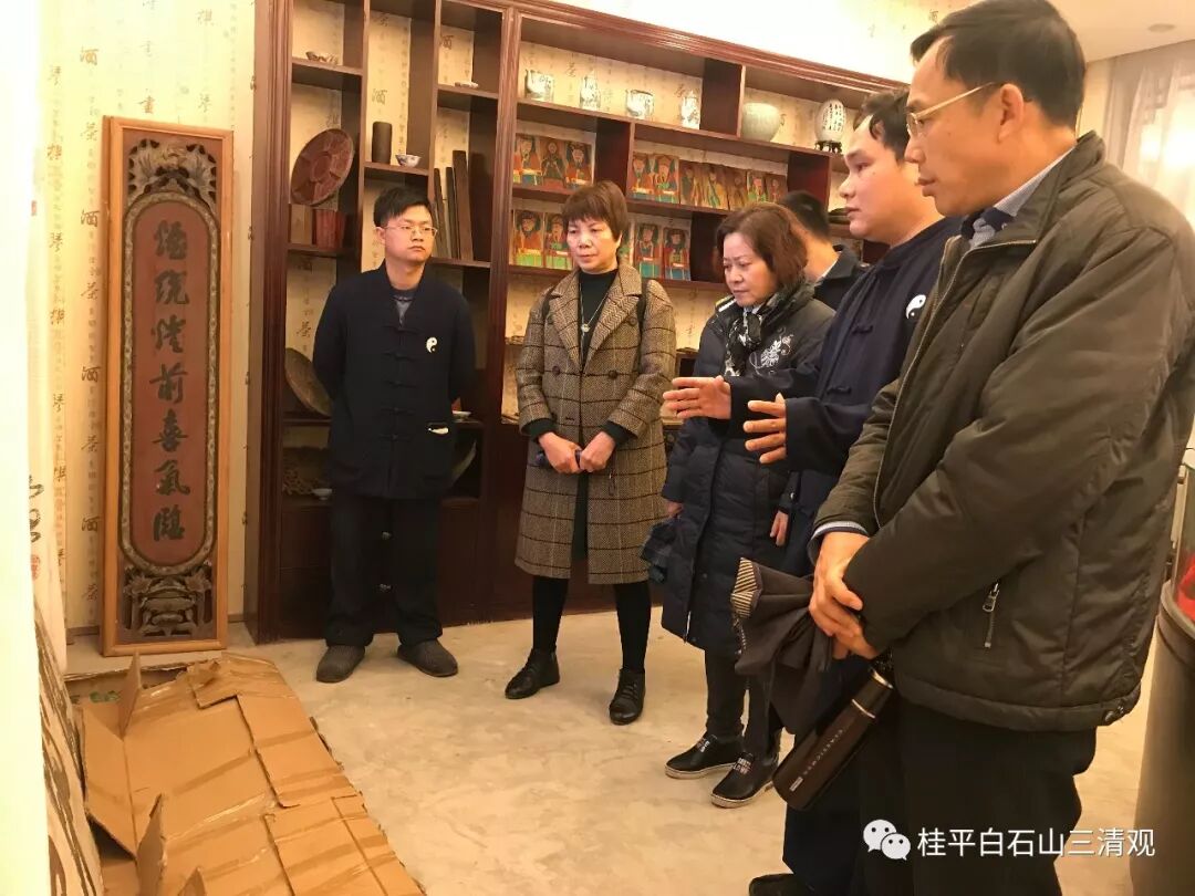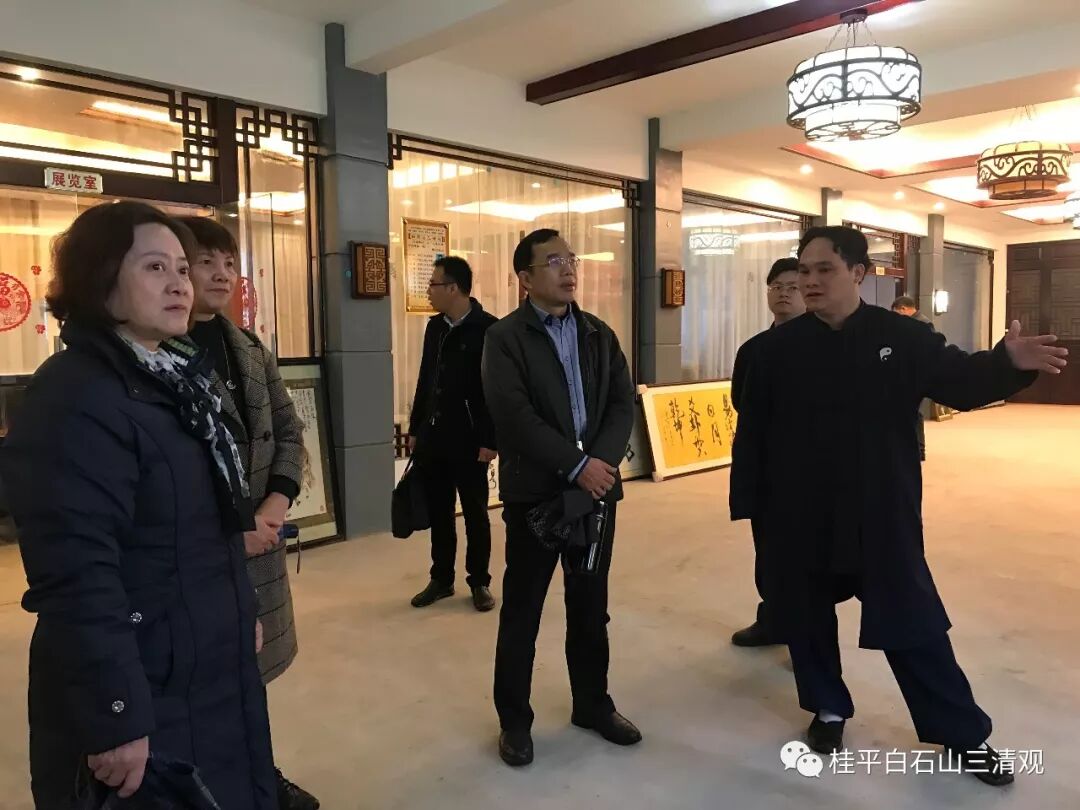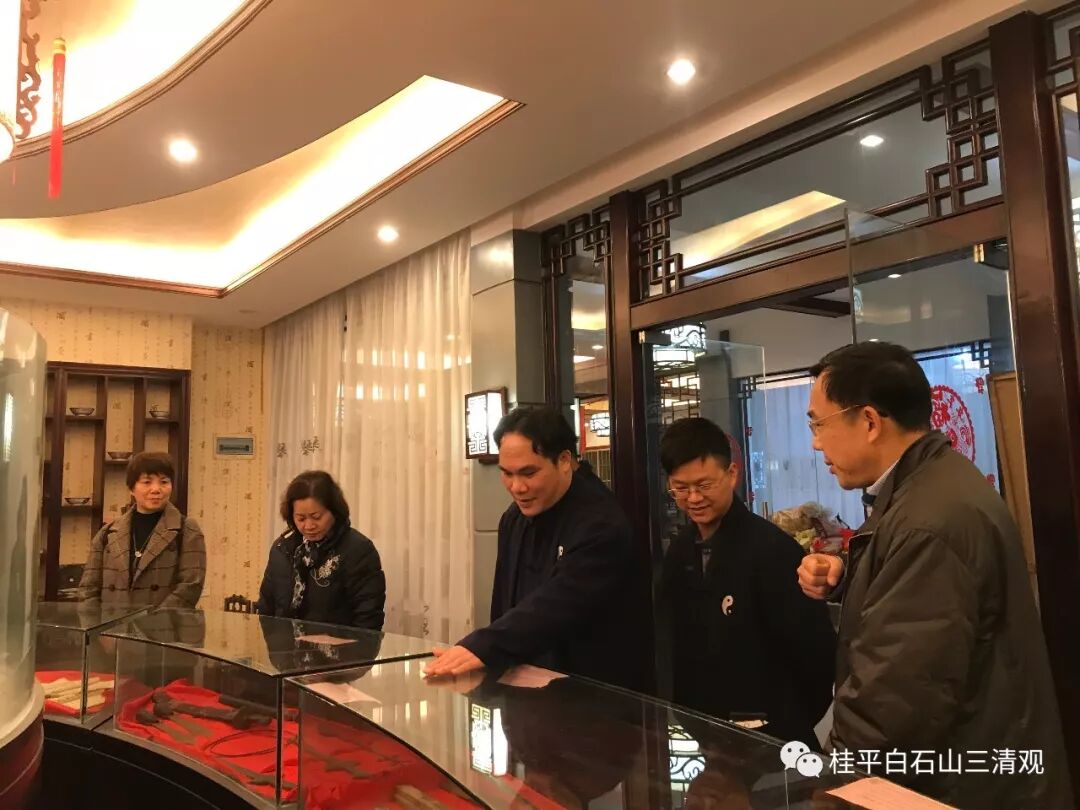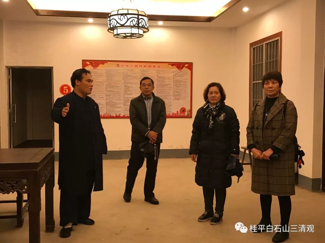 贵港市民宗委主任覃 宏、副主任莫松坚、桂平市民族宗教局局长谢晔华等一行领导参观白石山三清观会议室、文化展览室、学习园地、“五进”活动成果之一《宪法》宣传专栏等。